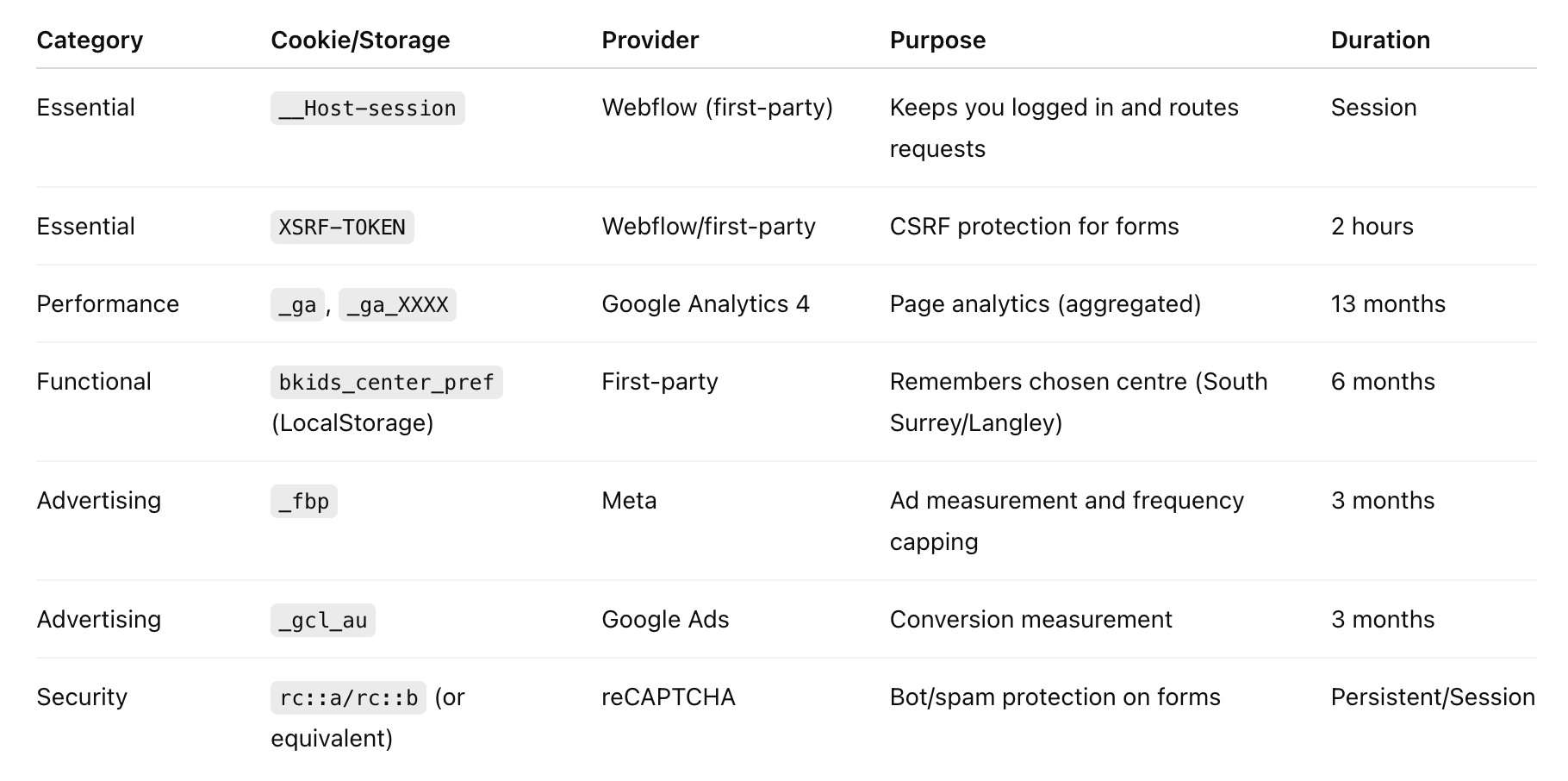 This Cookies Policy explains how B Kids Daycare (“B Kids”, “we”, “us”, “our”) uses cookies and similar technologies on bkidsdaycare.com and our parent/guardian portal and apps (collectively, the “Site”). Read this together with our Privacy Policy.